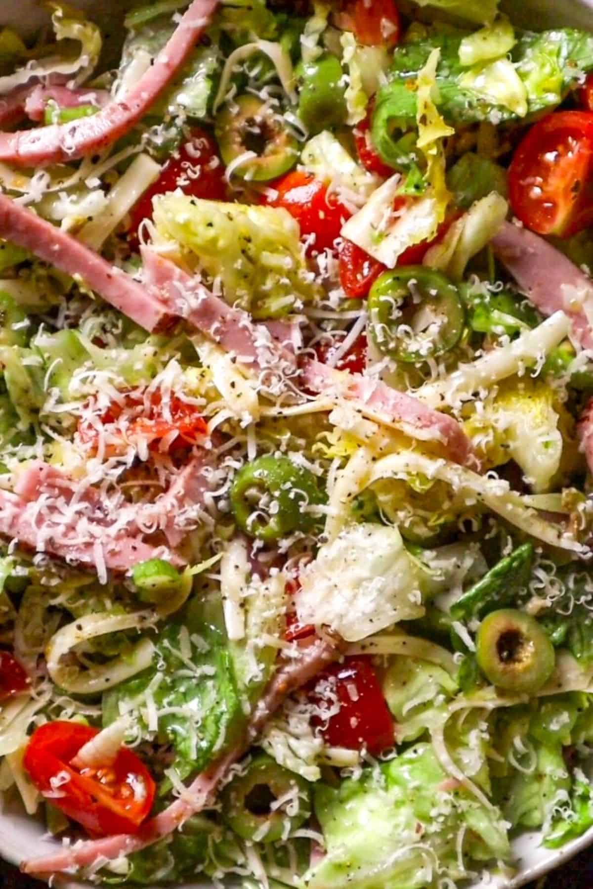 - In a large bowl, combine the chopped iceberg lettuce, quartered cherry tomatoes, sliced celery, freshly grated Swiss cheese, sliced ham, sliced green olives, and Parmesan cheese.