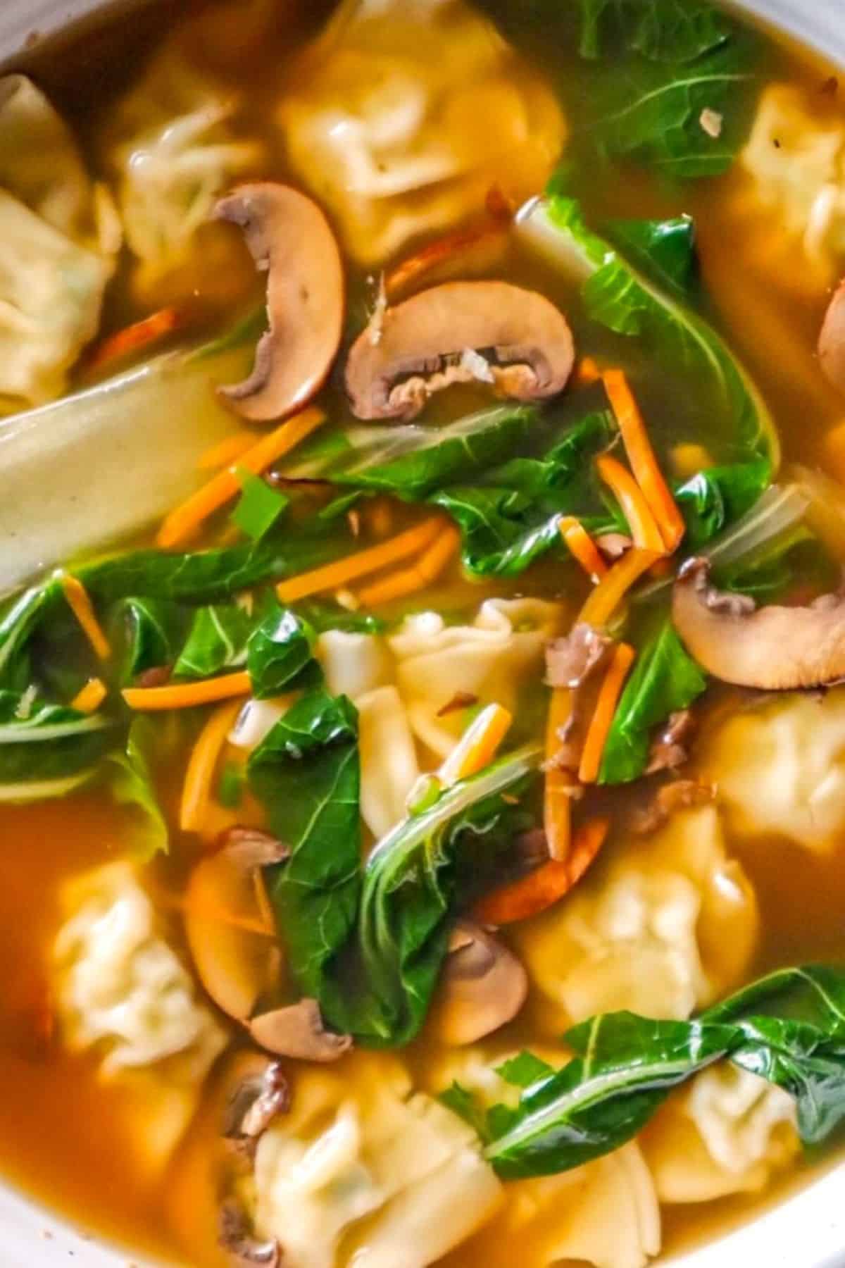 This Easy Wonton Soup is a simple blend of bok-choy, mushrooms, garlic, ginger, soy sauce, broth, and frozen wontons that comes together in one pot in just 20 minutes.