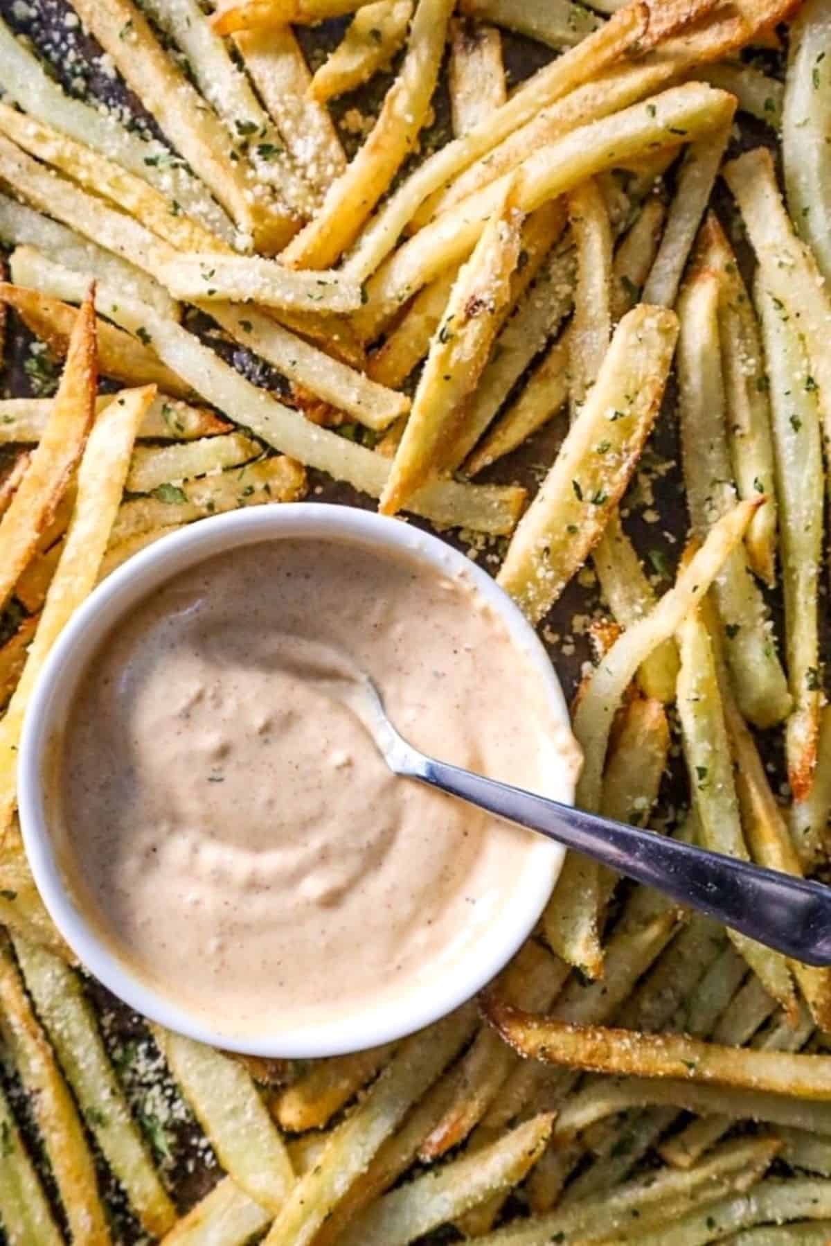- Make dipping sauce, whisk ingredients in a small bowl and chill. Mix salt, garlic powder, and pepper for fries in another bowl.