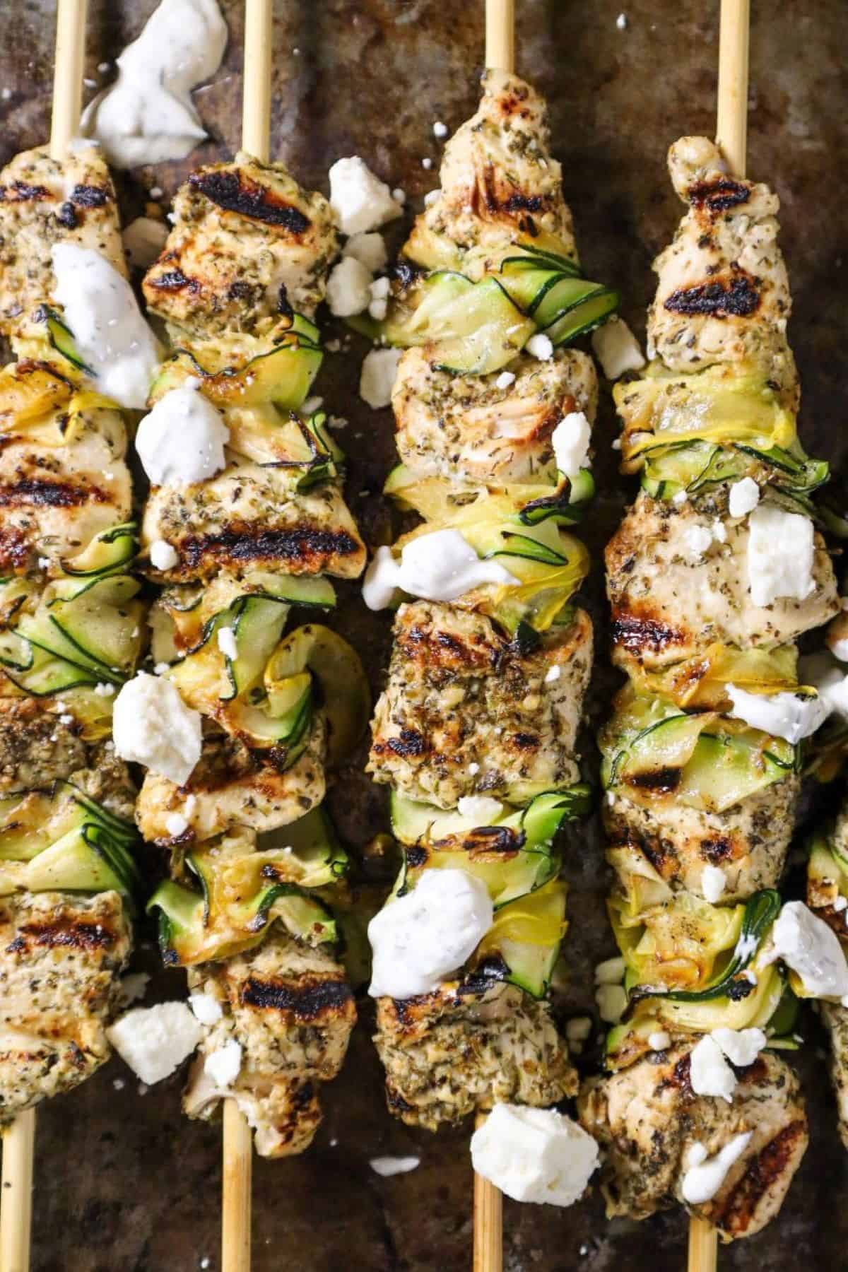 These Greek-Inspired Grilled Chicken Skewers with Zucchini Ribbons are by far one of my favorite things to whip up when the grilling mood strikes. Tender chicken marinated in a blend of minced garlic, extra virgin olive oil, lemon juice, and Greek-inspired herbs and spices, paired with thinly sliced zucchini and squash ribbons. Served with feta cheese and cucumber dill yogurt.
