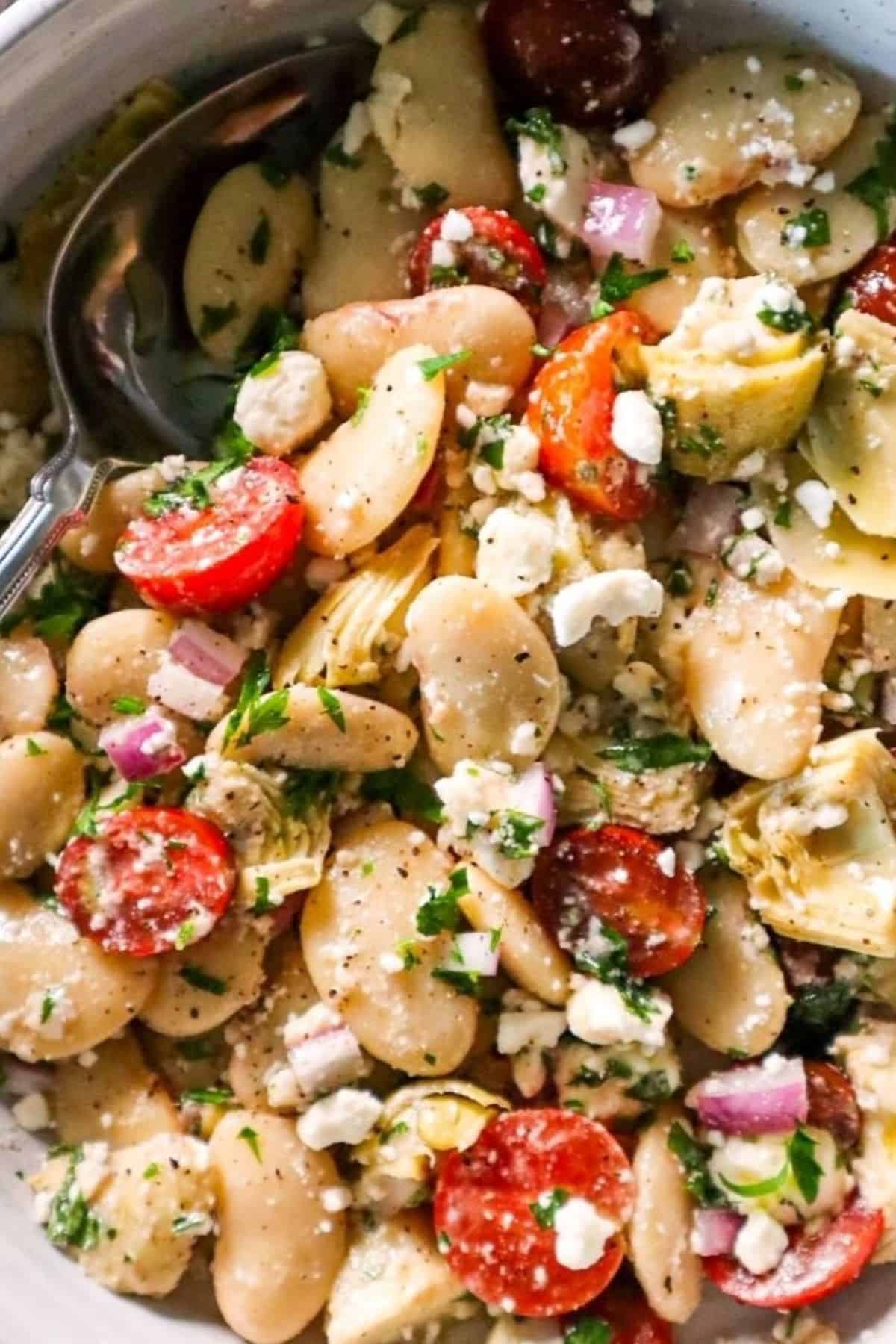 - Mix the Salad: In a large bowl, combine beans, tomatoes, red onion, artichokes, and feta.