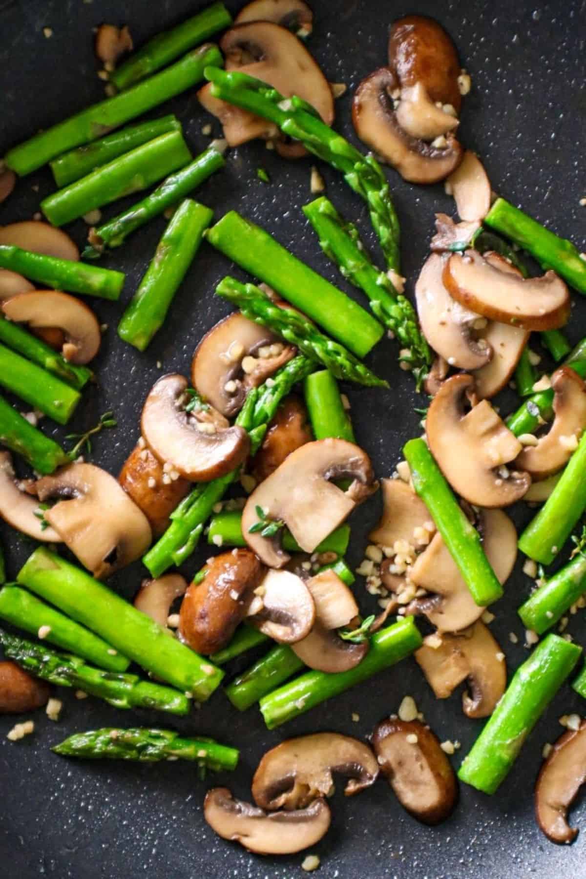 - Add the sliced mushrooms, asparagus, and a light sprinkle of salt.