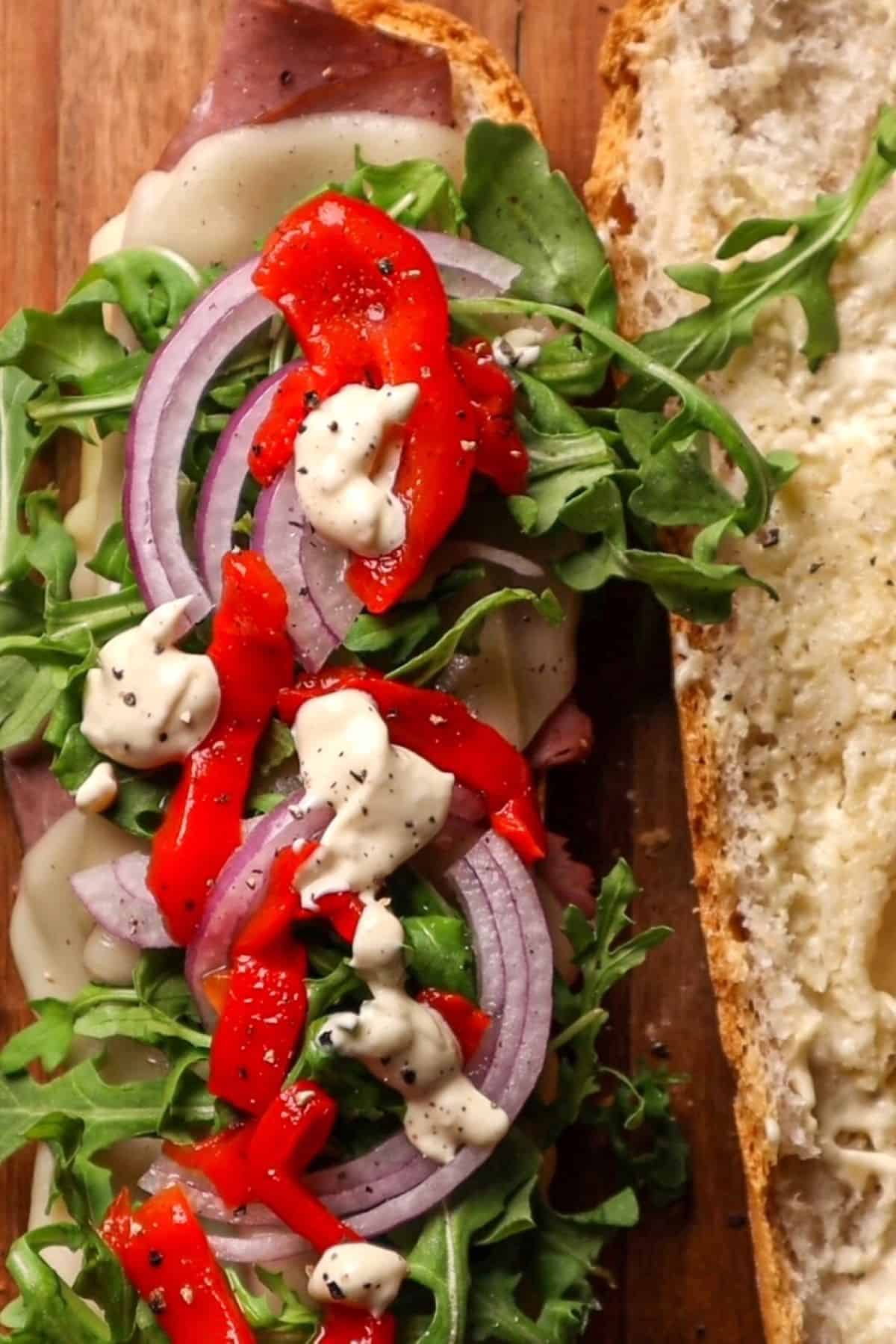 - Layer arugula, red onion, and roasted red peppers. Add more sauce if desired, close the sandwich, slice, and serve.