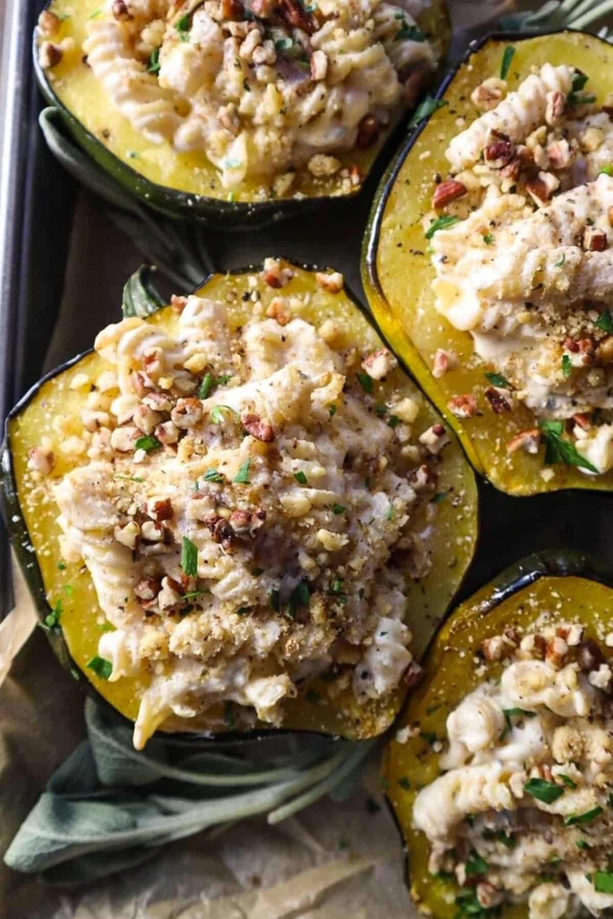 This Stuffed Acorn Squash is made by roasting the squash until tender and filling it with savory sage infused white cheddar mac. Topped with butter and chopped pecans then baked until golden.